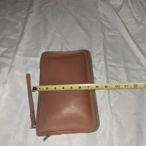 no brand leather wristlet, has d rings on the sides to attach a strap, smooth soft leather,, it's a vintage style some wear throughout the bag, strap needs to be re sewed but in good condition, fits a lot. smoke and pet free home