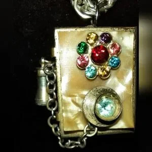 vintage mid century pill or trinket box. opens and closes. shaped like an old timey telephone. faded goldtone. colored rhinestones and a chain that leads to earpiece that hangs at the side. the sliver of pearl material is bowed up at the bottom. please see pictures for details and measurements and condition other items are display only bundle for savings chain is adjustable. unmarked. can be easily added to different chain bracelet or necklace etc