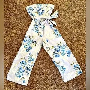 Elegant jumpsuit with blue floral pattern. Strapless design. Perfect for any occasion!
