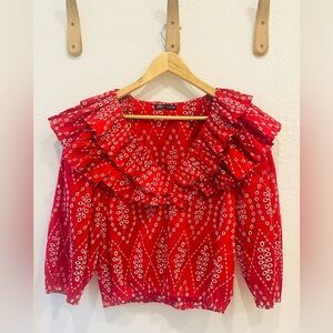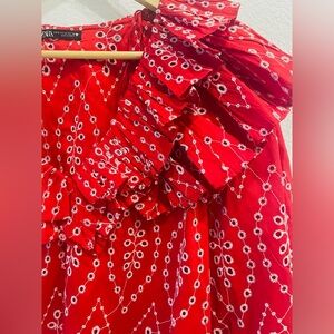 Zara Red/White Embroidered 3/4 Sleeve Ruffle Collar Top Size M