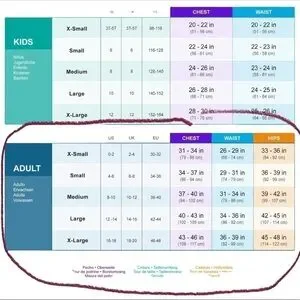 Sizing chart with dimensions is provided below from website under *Womens Adult swimwear (circled)