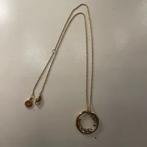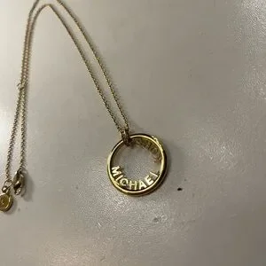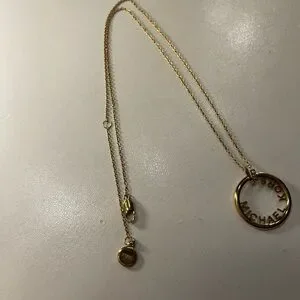 This exquisite Michael Kors necklace features a minimalist circular pendant crafted from gold-toned metal, elegantly suspended on a delicate link chain. The intricate detailing around the pendant adds a touch of sophistication, making it a versatile accessory for any occasion. This was a gift I never have worn so it is in good condition. It is steel and plated in gold that I’m not sure if it is real or costume. Cute though