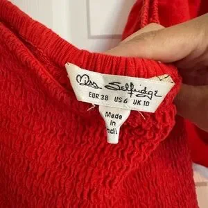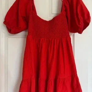 Elegant scarlet dress with textured fabric. Features stylish puff sleeves.