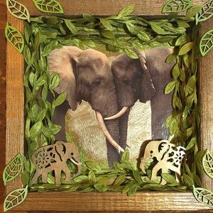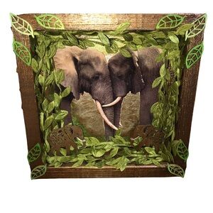 The background is hand-painted in rich metallic hues of brown, green, and gold, evoking earthy elegance and spiritual warmth. Soft green satin leaves—salvaged from repurposed decor—frame the elephants, bringing texture and life to the piece. The solid wood frame, also upcycled, is painted a deep metallic brown for a grounded, polished finish with wooden die cut hand painted leaves.