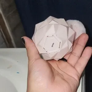 Elegant perfume in a faceted blush pink bottle. Features a soft pom pom accent.