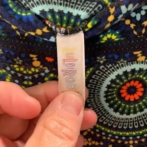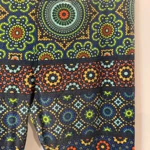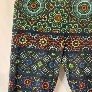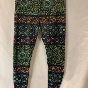 These LuLaRoe leggings feature a vibrant blue and green geometric pattern, offering a stylish and comfortable fit. The intricate design is printed on a stretchy fabric, making them perfect for any casual occasion.