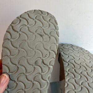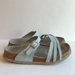 Stylish sky blue sandals with triple straps. Features a supportive cork footbed. Perfect for everyday comfort.