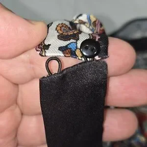 🚨missing a little button🚨 last picture better description. Elegant fabric with intricate orange patterns on black. Ideal for stylish creations.