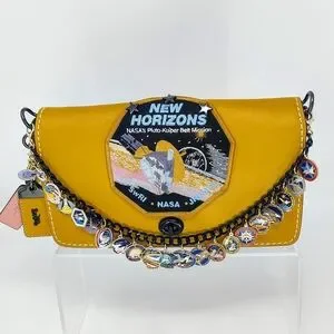 On the front, you’ll find an authentic NASA patch securely attached and accented with three gunmetal stars. A custom bag chain featuring 21 NASA mission charms adds extra flair. On the back, there’s a leather Coach leather pin that proudly says “NASA"