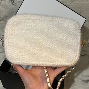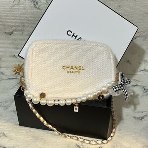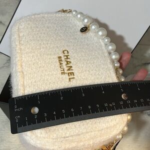 Chanel Beauty White Tweed Cosmetics Pouch from their holiday collection, cute snowflake zipper pull