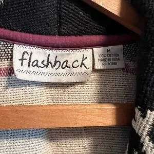 Like new tapestry blazer by Flashback. Vintage beauty. Snowflakes in cream, maroon, black and gray. One front bottom close. Pockets. Button with strings are very pretty accents. Size Medium. This is one for your collection.