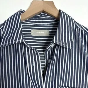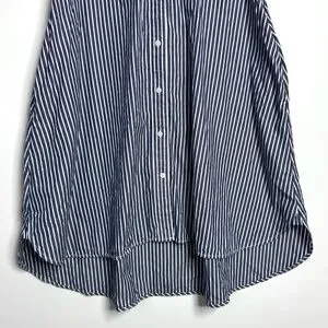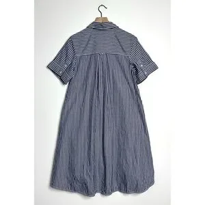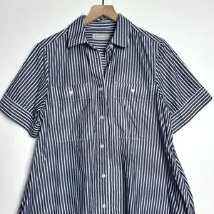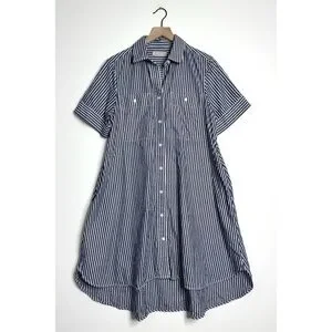 - Keywords: short sleeves, button front, shirt dress, striped, loose fit, high-low hem, pockets, casual, workwear, classic