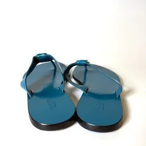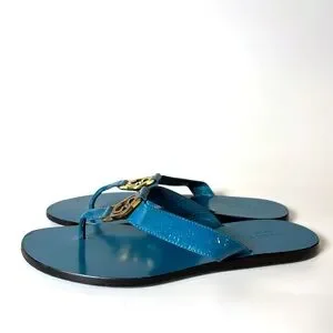 Authentic Gucci thong sandals in glossy blue patent leather with gold-tone GG logo hardware.