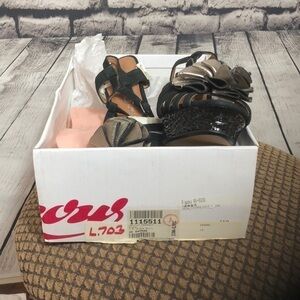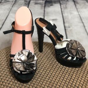 These are very sexy sandals. Suede with bronze leather flower detail.