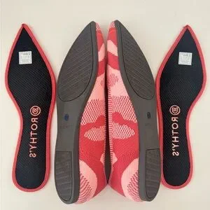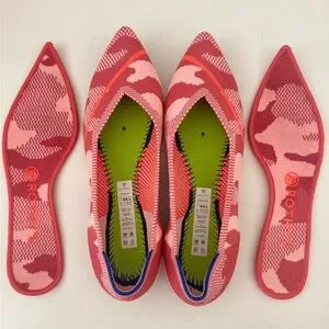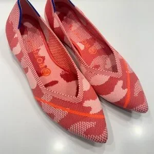 Step out in style with Rothy's chic flats. These pink and orange shoes offer a perfect blend of comfort and fashion. Ideal for any occasion. San Francisco store exclusive peach camo print 8.5. (Street size 7.5/8) very lovely condition!