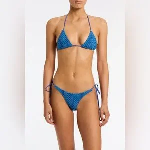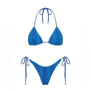 Experience the elegance of simplicity with this blue bikini set from Triangl Swimwear. Featuring a classic triangle top and matching bottoms, this swimwear offers a modern minimalist design with traditional tie straps. Perfect for making a stylish statement at the beach or pool.