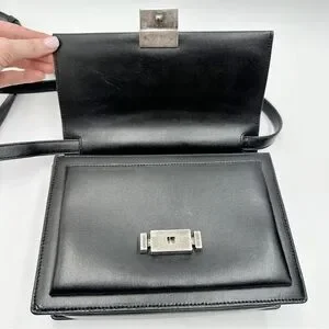 Black 'Bellechasse' shoulder bag from Saint Laurent. Made of smooth leather and suede. Snap fastening with embossed logo. Detachable and adjustable shoulder strap. Black suede interior with 2 compartments and 1 slip pocket. Antiqued silver-tone metal hardware.