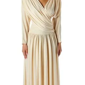 Step into elegance with this stunning cream maxi dress. Featuring long sleeves and a flowing silhouette, it's perfect for any occasion.