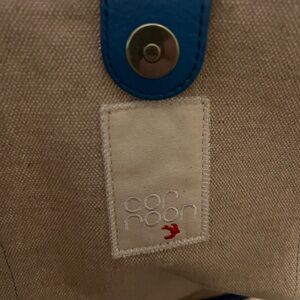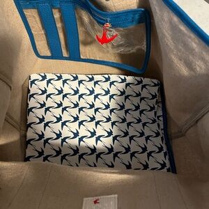 Stylish and spacious, the linen tote bag features a classic tan canvas with striking blue accents, and leather trim and handles, initials KMB with a bee on the other side. Metal feet to keep it out of the dirt. Has a separate divider to keep items separated. Basically new. Perfect for toting along all your stuff to parks, games or weekends at the shore.
