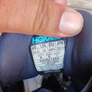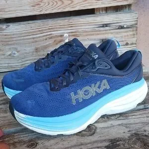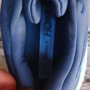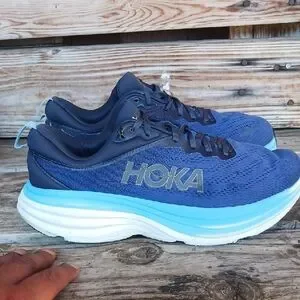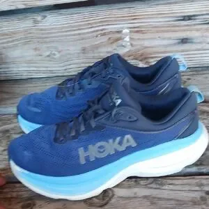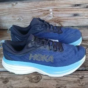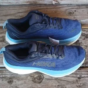 shoes are in excellent condition .Experience unparalleled comfort and breathability with these Hoka athletic shoes, featuring a deep navy blue mesh upper and signature chunky midsole for optimal impact absorption. The sleek design is complemented by a light blue accent layer, making them perfect for running and other athletic activities.