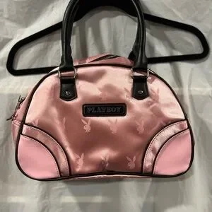 This PLAYBOY shoulder bag features a stunning metallic pink body complemented by sleek black accents, creating a chic and modern look. Its structured design and curved panels offer a contemporary twist on the classic bowling bag style, making it a perfect accessory for any occasion.