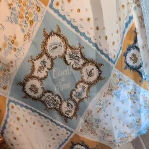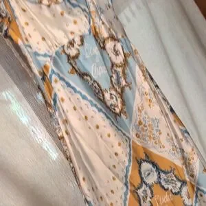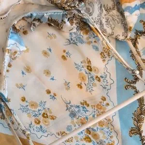 Elegant sky blue dress featuring gold leaf patterns. Perfect for any occasion.