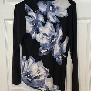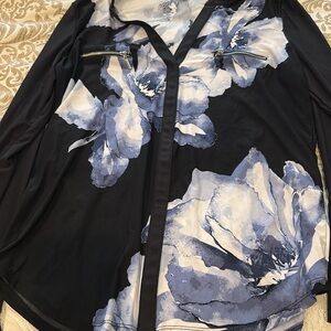 INC women’s Chic blouse with bold floral pattern. Features zipper accents. Ideal for stylish occasions.