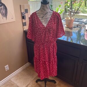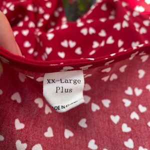 Ladies’ XXL red wrap v-neck dress with white hearts. Short sleeves, ruffle hem, A-line silhouette.