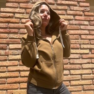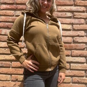 Super soft lightly worn drawstring full zip hoodie with robust zipper. Oversized XS but will fit a Small or Medium. The color is very unique and earthy-between green and brown. I am 5'7, 155lbs and 38in chest.