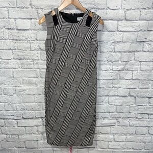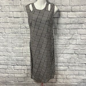 Versatile sheath style midi dress with a black and white hound's-tooth design. Cut-outs at the shoulder. Fully Lined. Measurements are shown in the photos