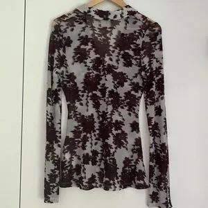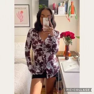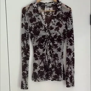 Stand out in this so special button-front top featured in a bold, retro-inspired print with ruching at center for added dimension.