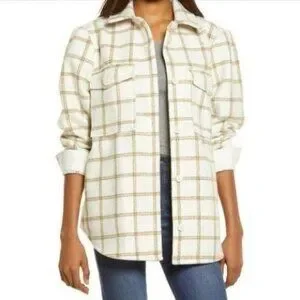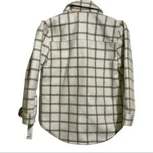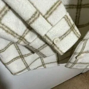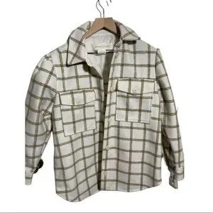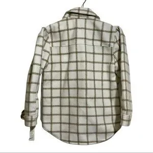 NWT, excellent condition, cute tan/olive green stripes and cream colored shirt jacked. Features puffed sleeves, reversible cuffs, two chest pockets, curve shirttail hem, button up, 100% polyester. No holes, stains or tears. Extra buttons attached.