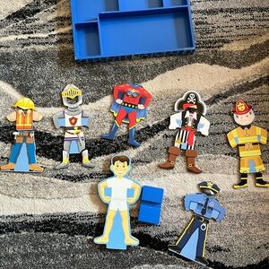 Melissa and Doug Joey wooden set. Magnetic pieces with the figure and box. The set is missing a few hands with some outfits, everything else is there.