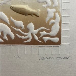 Embossed watercolor, with salmon carved from bone for embellishment