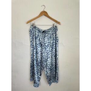 Satiny pajama set with blue leaf pattern. Tank top featured adjustable straps and pants have elastic drawstring waistband.