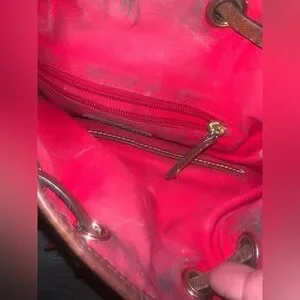Perfect for everyday use, this shoulder bag is spacious enough to hold all your essentials. The drawstring closure ensures that your belongings are safe and secure. Gold hardware. Adjustable strap. Outside very good condition. Inside needs cleaning. Please see pictures. No tears. Inside pockets. working zipper.