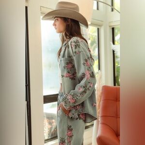 Stylish denim shirt jacket pink floral design. Perfect for a casual look. Shacket Button Up Denim Perfect for Layering