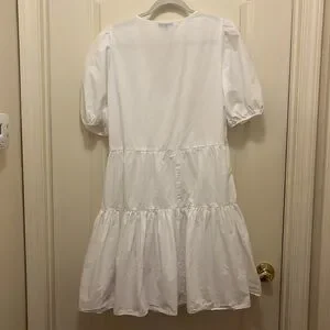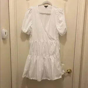 Elegant white midi dress. Features a wrap design. Puff sleeves add charm. Perfect for any occasion.