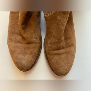 Classic and stylish Stuart Weitzman over-the-knee boots in luxurious suede. Features a sleek almond toe, low block heel, and pull-on style with tie detail at the back. Light wear and some discoloration present, as shown in the photos, but still in good condition.