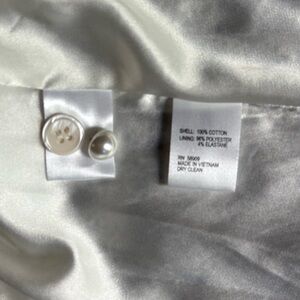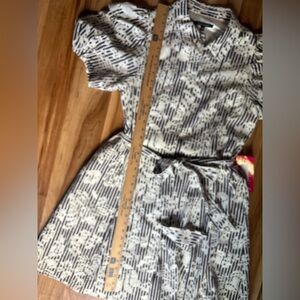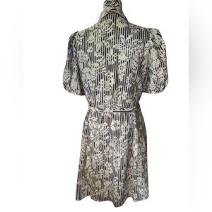 Elegant Alex Marie dress with unique eyelet pattern over black and white stripes. Lined with puffy sleeves and tie belt.