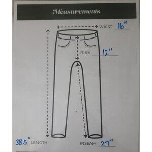 Waist = 16 inches (laying flat); Inseam = 27 inches.