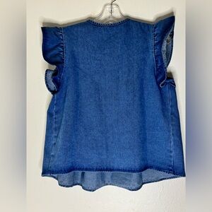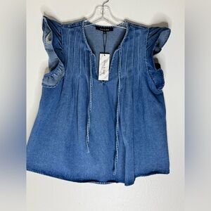 This elegant Strut and Bolt denim blouse features a sleeveless design with a charming tie front and delicate ruffles. The bib collar adds a touch of sophistication, making it a versatile piece for any occasion. Perfect for pairing with your favorite bottoms for a chic and stylish look.
