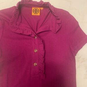 Chic fushia Tory Burch shirt with ruffle details. Features button-down front. Ideal for versatile styling.