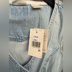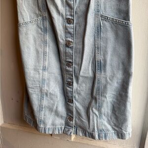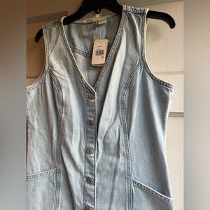 Denim light blue mini dress. Features button-down front. Sleeveless design. And everyone’s favorite, pockets! Can be dressed up or down, staple for any wardrobe!