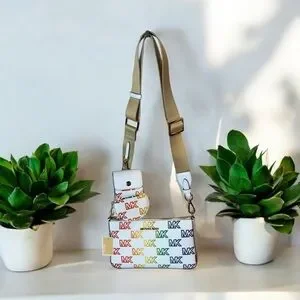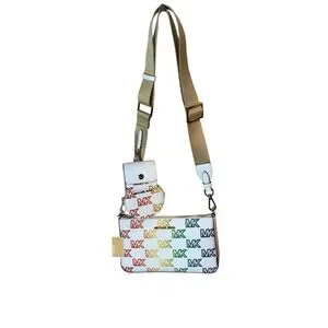 Add a pop of color to your look with this stunning Michael Kors Rainbow Multi Logo Crossbody Bag. This bag features a bold all-over MK logo in vibrant rainbow tones, gold-tone hardware, and an adjustable canvas strap. Includes detachable round coin pouch, original tags, care card, and dust bag.