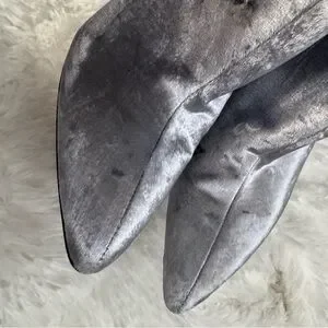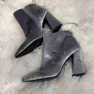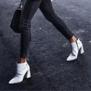 Step into sophistication with Stuart Weitzman's heeled boots, featuring a sleek silver-gray finish and a chic block heel. These minimalist ankle boots offer a modern design with a pointed toe and a convenient side zipper closure, making them a versatile addition to any wardrobe.