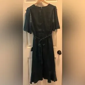 NWT Dark Green/Emerald Green dress from Lulus. Size L. This is a faux wrap, so it is sewn together internally for security. Features a ruffled skirt.