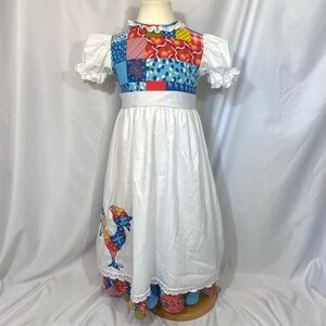 Incredible vintage 70’s Nanette patchwork chicken maxi dress. This is definitely top 5 cutest dresses that have ever passed through my hands. The dress is a lightweight poly/cotton/rayon blend. It has white sleeves and apron with patchwork print bodice, hem, and chicken appliqué on the apron. It has white eyelet trim and ties at the back.