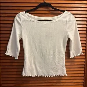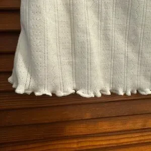- White knit top with lettuce edge hem on body & sleeve openings.