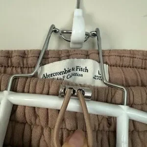 These Abercrombie & Fitch jogger sweatpants in a warm brown hue offer a relaxed fit with elastic cuffs and waistband, perfect for casual athleisure wear. The lightweight fabric provides comfort and a slightly rumpled texture for a laid-back style.